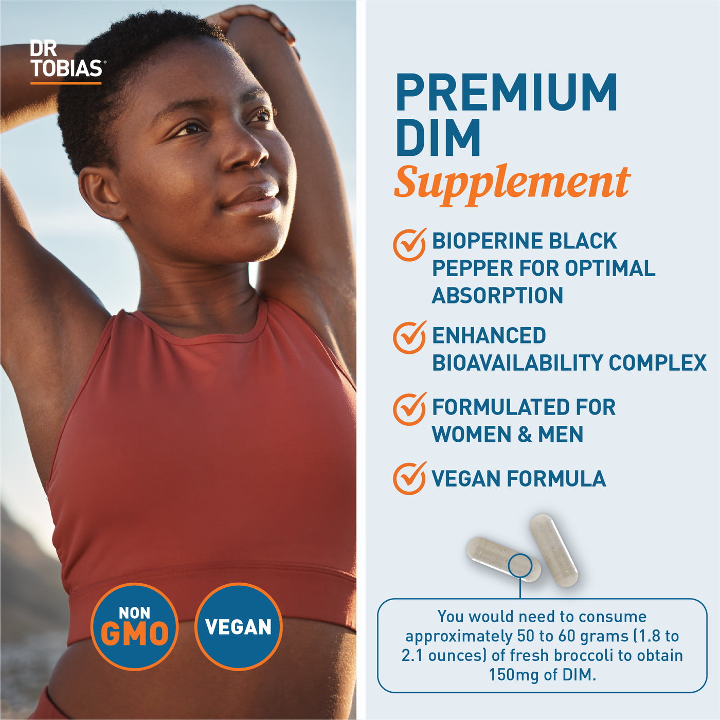 Dr. Tobias DIM Complex offers an easy and effective way to ensure you get your daily dose of this useful balance complex. Our premium DIM Supplement delivers 150mg of DIM per serving, formulated with BioPerine Black Pepper for optimal absorption. Dr. Tobias DIM Complex rivals other DIM supplements. Our unique DIM Complex includes Broccoli Extract and Calcium D-Glucarate which work synergistically to enhance the bioavailability of DIM and support detoxification processes. It is suitable for those looking for menopause relief, pms relief, hot flash relief, or simply trying to find some natural balance.