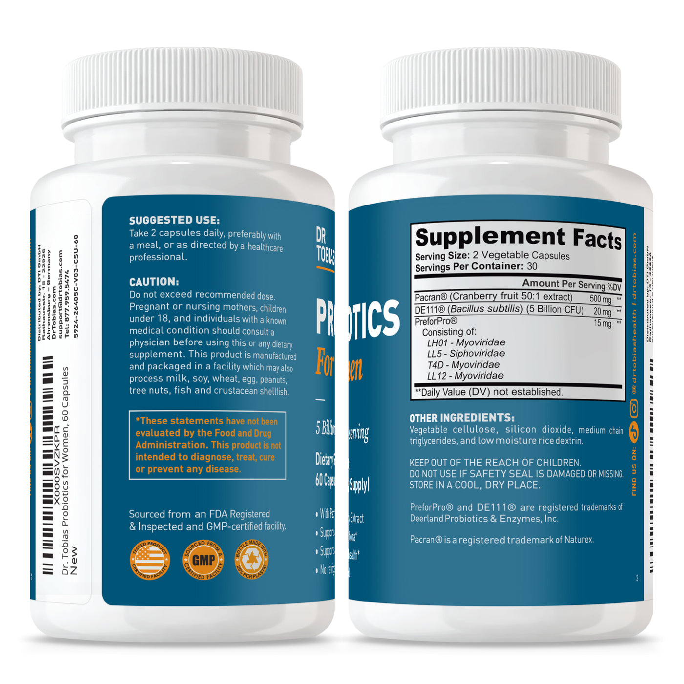 Dr. Tobias womens probiotic supplements are non-GMO and made with care by our vitamin experts in a facility that follows GMP (Good Manufacturing Process) guidelines in the USA.